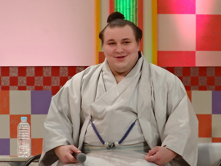 NHK福祉大相撲でトークショーに臨む安青錦。綱とりに挑む3月の春場所に向け、「今まで通り、やるべきことをやる。横綱を目指して頑張る」と観客らに昇進への意欲を示した=7日、東京・両国国技館 【時事通信社】