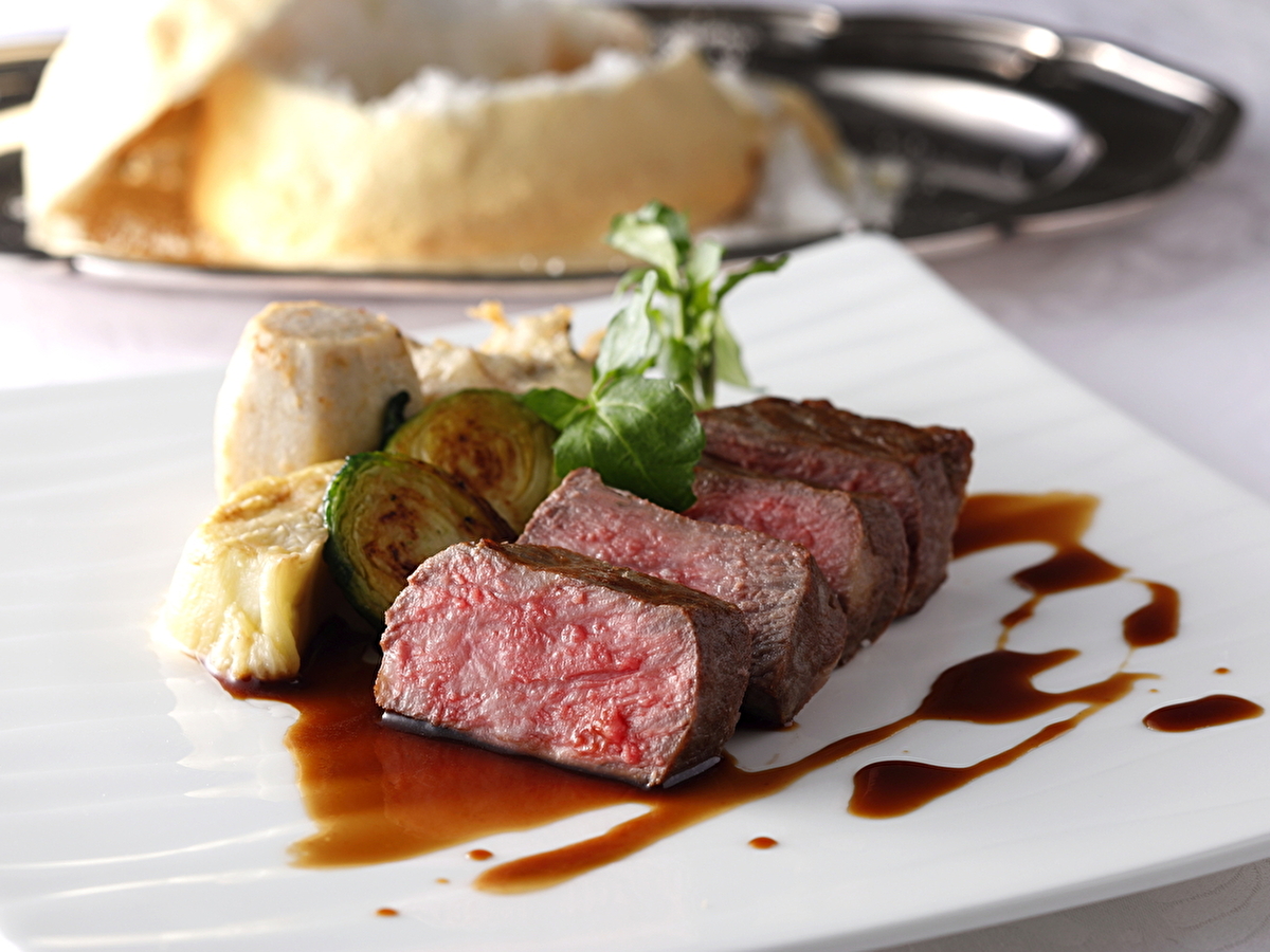 福井県産「若狭牛」サーロインの塩釜焼と「九頭竜まいたけ」のフリット 「米五味噌」のソース