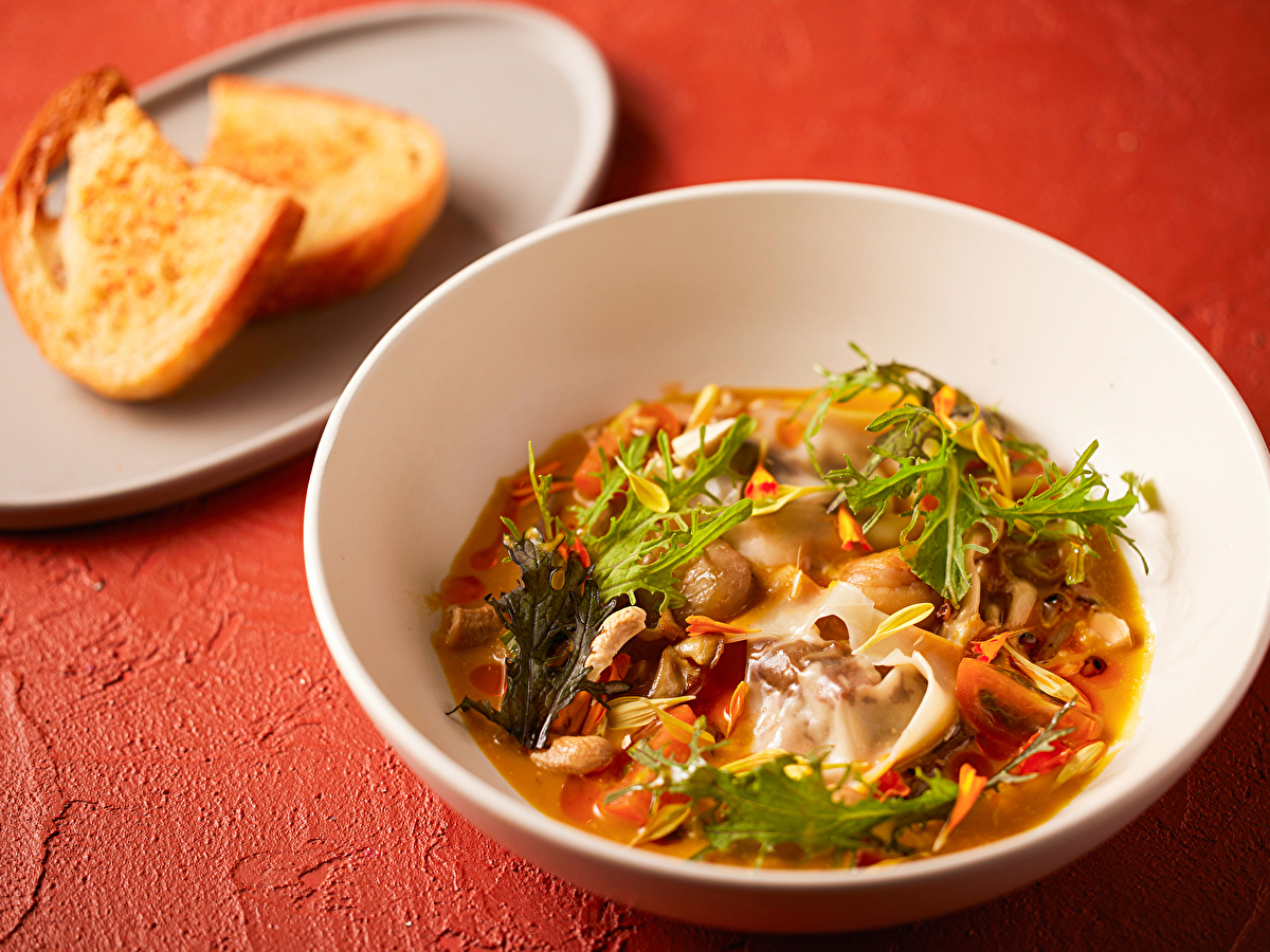 マッシュルームのダンプリングとバターナッツかぼちゃのスープ