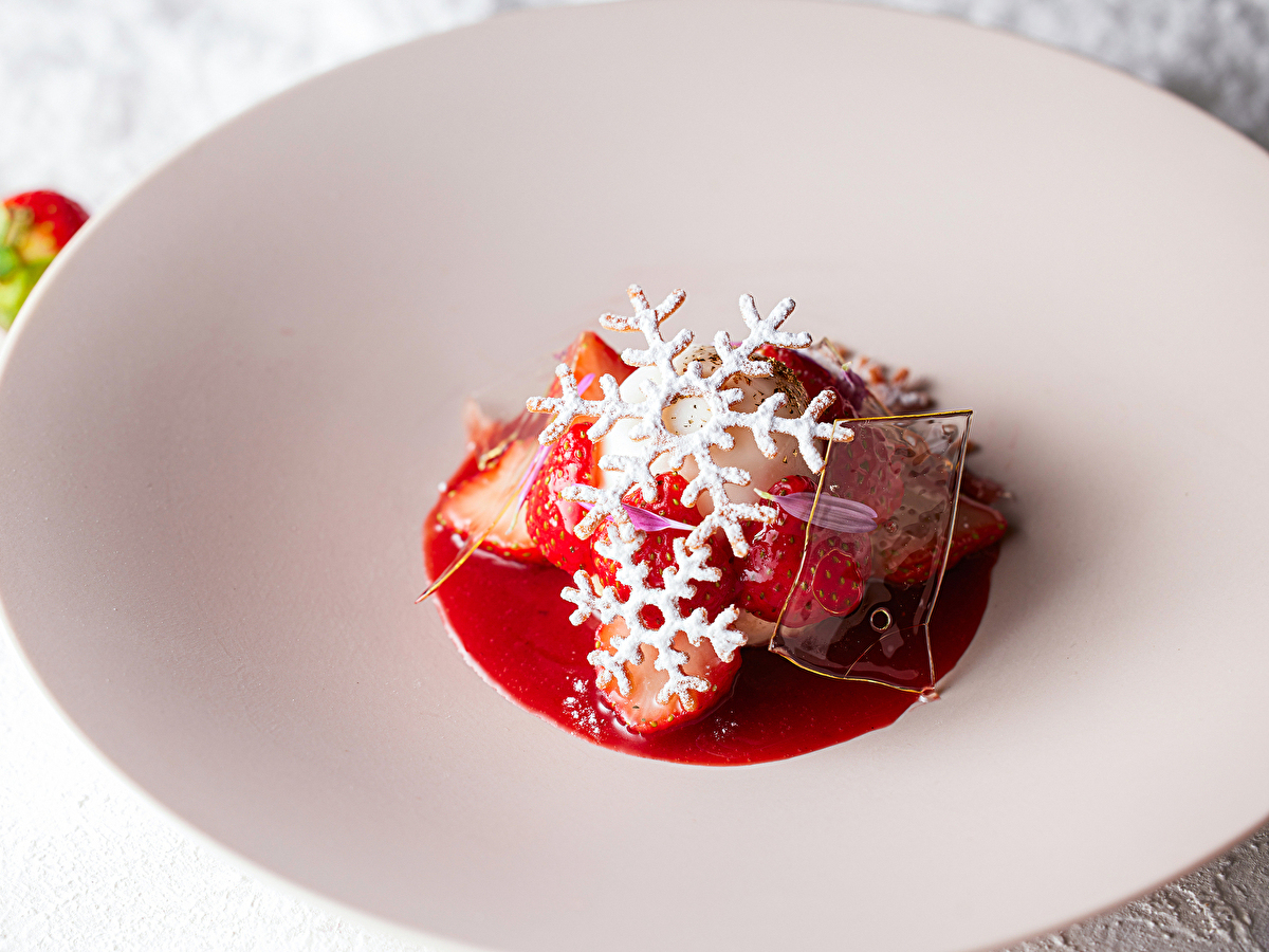 プレミアムプランで提供する「あまりんの苺ミルクスノードームパフェ」