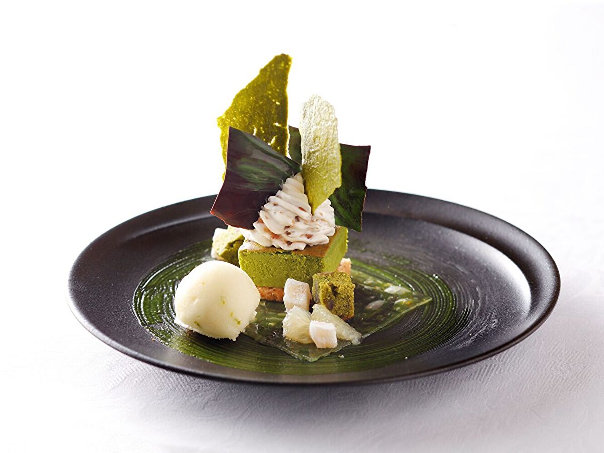 宇治抹茶のチーズケーキ 柑橘の香りのシャーベットとともに