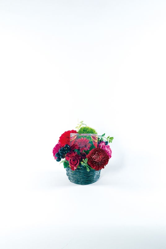 情熱的な赤と深いバーガンディの花々が響き合い、秋の深まりを思わせる力強くも洗練されたアレンジメント。中央にあしらわれたCHIAKI AKADA STUDIOのアートは、音楽のような余韻を残し、空間に静かなインパクトを与えます。季節のギフトとしてはもちろん、アートを纏うインテリアとしても印象的な一品です。