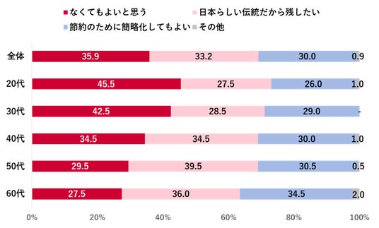 物価高が続く中での「おせち」の存在意義については、「なくてもよいと思う」が全体の35.9%だった。「日本らしい伝統だから残したい」が33.2%、「節約のために簡略化してもよい」が30.0%と、三者が拮抗した。年代別では20~30代で“不要派”が4割を超え、50~60代では“伝統派”が約4割だった。
