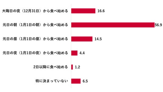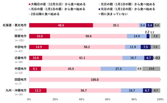 おせちを食べるタイミングは「元日の朝から」が56.9%で最多だったが、北海道・東北地方では「大晦日の夜から」が48.6%と地域差が見られた。