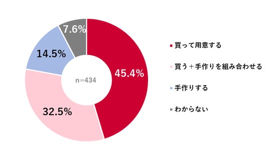 おせちの準備方法について聴取したところ、「買って用意する」が45.4%、「買う+手作りを組み合わせる」が32.5%となり、合わせて77.9%が何らかの形で購入すると回答した。「手作りする」は14.5%だった。