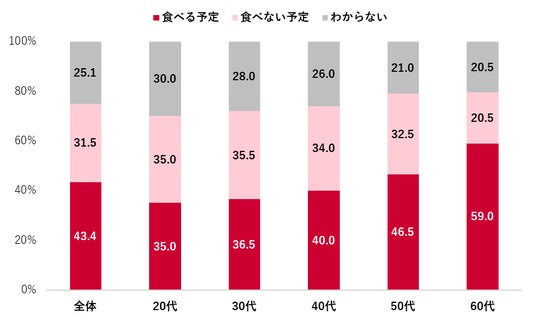年代別では、20代の「食べる予定」が35.0%にとどまった。年代が上がるほど高くなり、60代では59.0%と、世代による差が顕著に表れた。