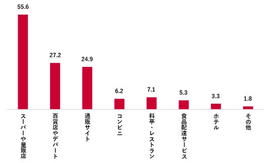 購入先は「スーパーや量販店」(55.6%)が最多で、「百貨店やデパート」(27.2%)、「通販サイト」(24.9%)が続いた。