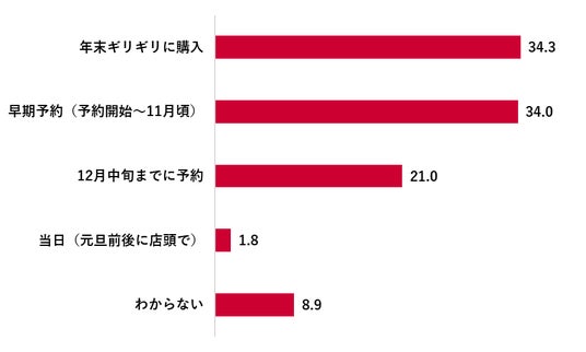購入時期は「年末ギリギリに購入」(34.3%)と「早期予約(予約開始~11月頃)」(34.0%)が拮抗している。